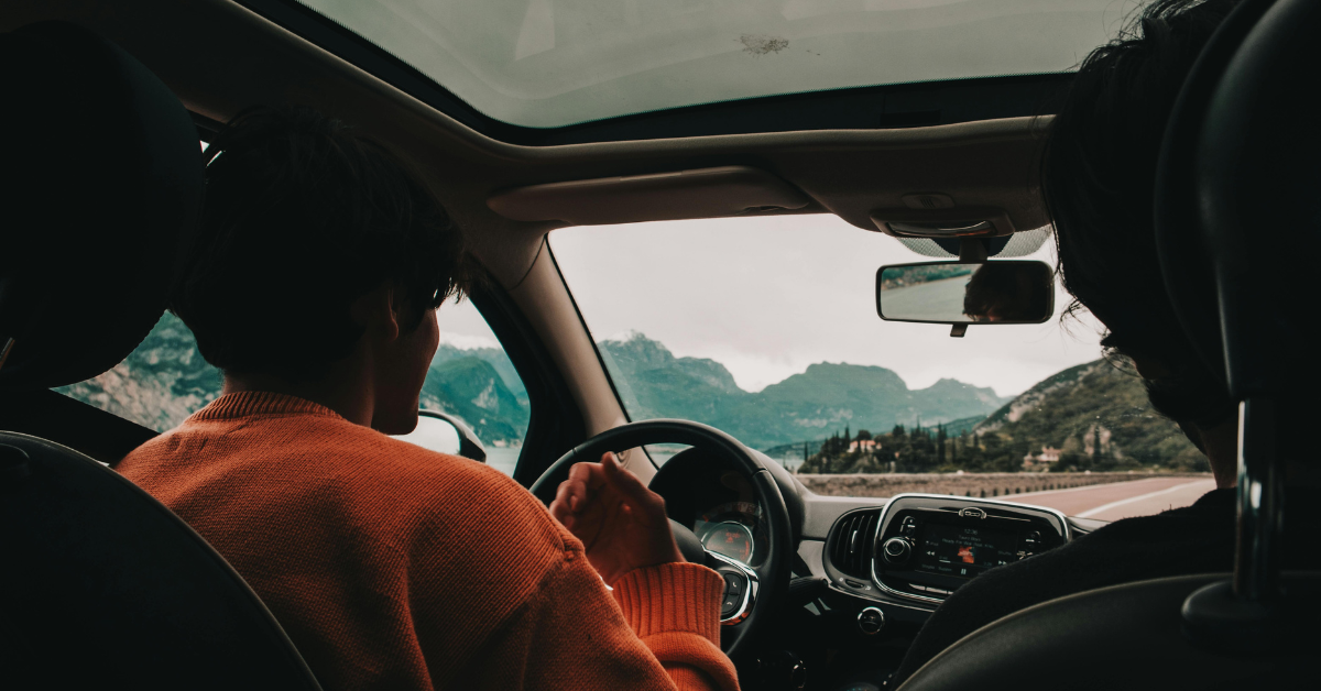 Two people in the front seats of a car driving through mountains, captured from the back seat with a scenic road ahead, enabled by Luup car sharing Vancouver